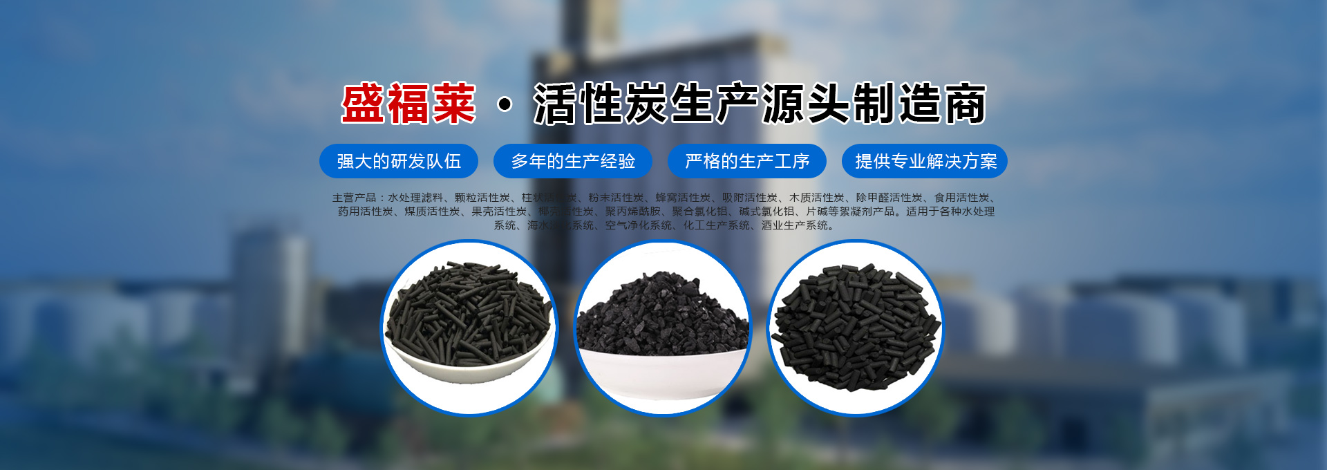 河南盛福萊環保科技有限公司是一家專業銷售各種規格型號活性炭、污水處理藥劑、碳源的公司,位于中原凈水材料基地-鞏義市,是從事各類活性炭及相關產品生產、研發及銷售的一體化企業。主營產品:水處理濾料、顆粒活性炭、柱狀活性炭、粉末活性炭、蜂窩活性炭、吸附活性炭、木質活性炭、除甲醛活性炭、食用活性炭、藥用活性炭、煤質活性炭、果殼活性炭、椰殼活性炭、聚丙烯酰胺、聚合氯化鋁、堿式氯化鋁等絮凝劑產品、碳源,適用于各種水處理系統、海水淡化系統、空氣凈化系統、化工生產系統、酒業生產系統。服務于各種大、中、小型自來水廠、石油化工廠、造紙印染廠、鋼鐵廠、發電廠、食品廠、冶金廠等行業。河南盛福萊環??萍加邢薰緞摿⒁詠?